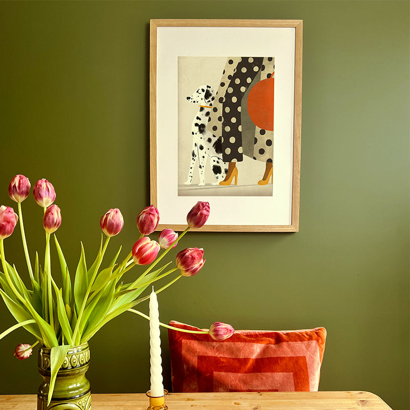 Send your dog loving friend the perfect gift with this Dalmatian art print. This illustration print features a glamorous woman walking her elegant Dalmatian in a polka dot coat and suit.