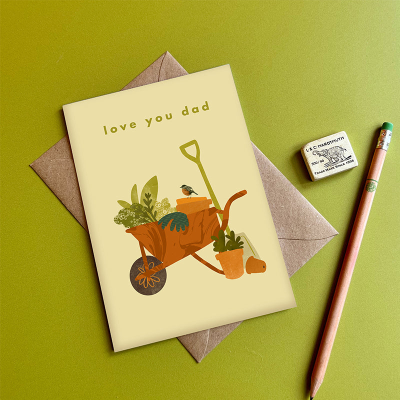 Illustrated by Emily, who wanted to create a collection of classic Father's Day cards for the favourite men in our life, this wheelbarrow card is for the caring Dad's who love the garden.