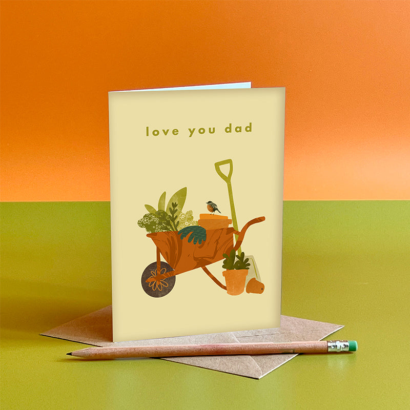 Show your Dad he means the world to you this year with this gardening Father's Day card. This card is an illustration wheelbarrow full of plants and gardening tools with the perfect, simple message to say Love you Dad.