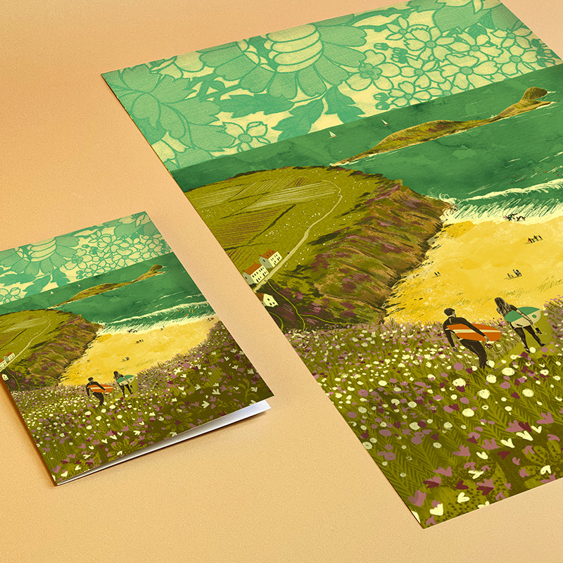 Encapsulating the beauty of Rhossili Bay, this Gower print features an illustration of two surfers walking through the heather towards the beach.