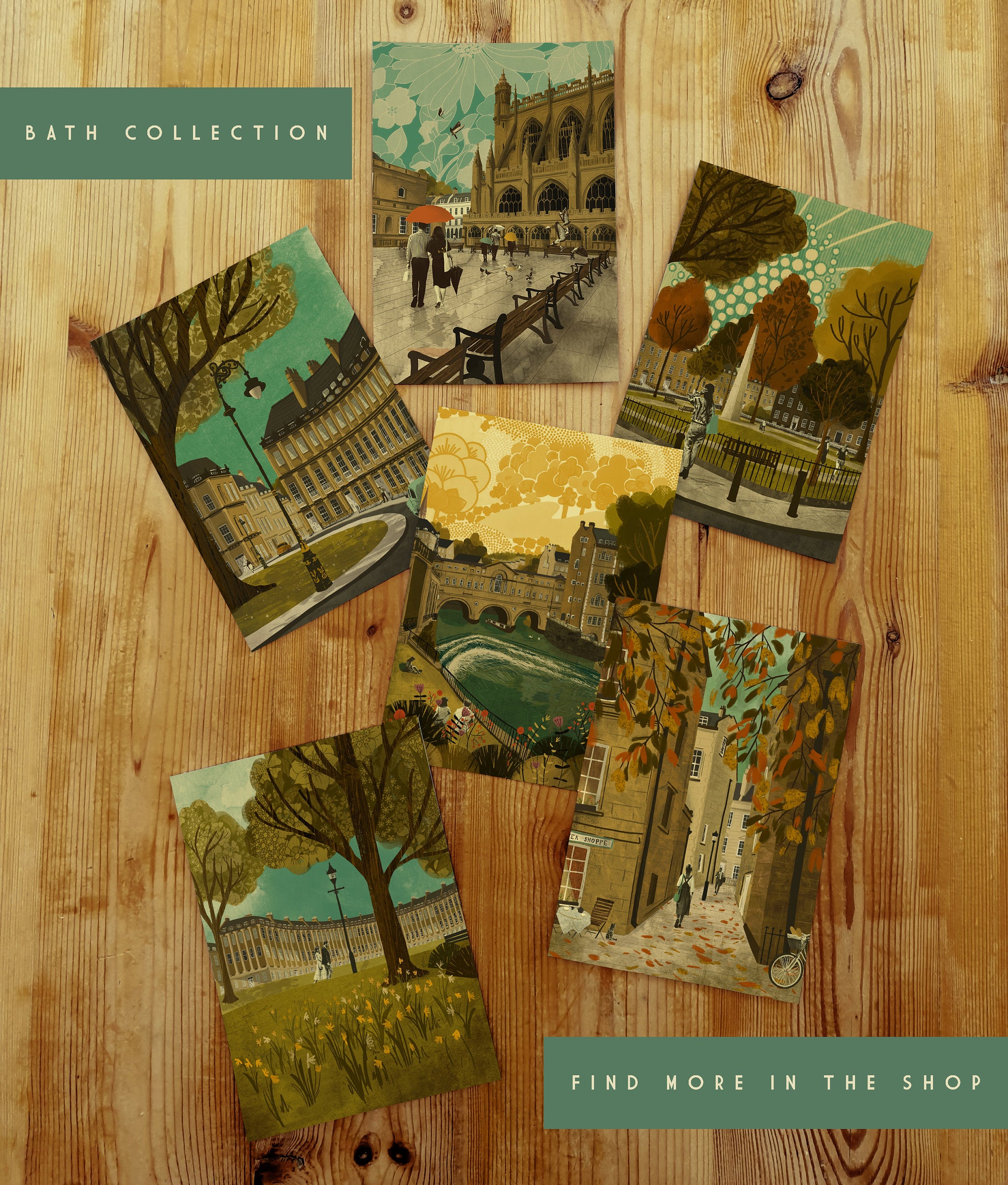 All artworks are unique illustrations created by Emy Lou Holmes. ‘Bath Abbey’ was drawn digitally in Procreate and Photoshop.