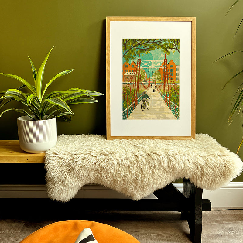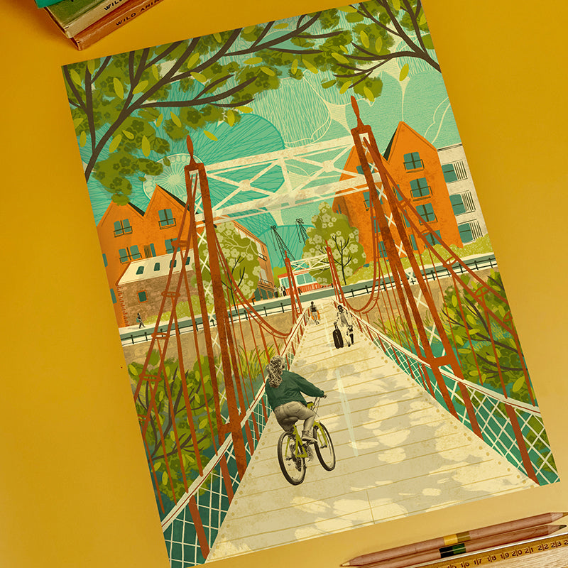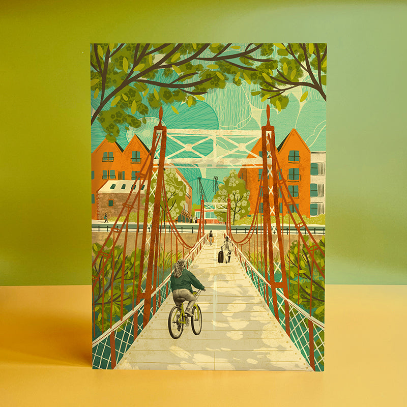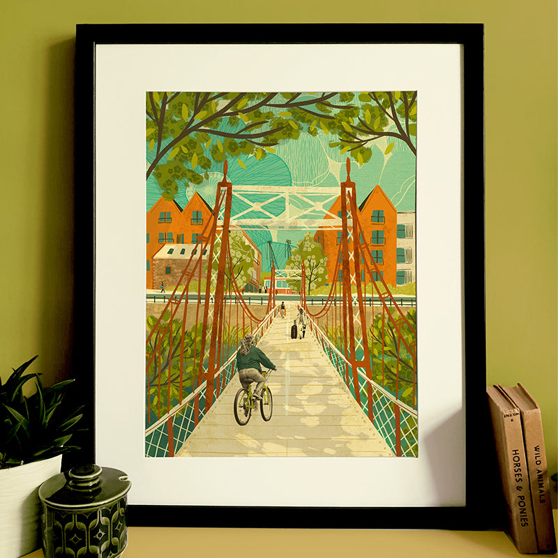 Transport yourself to the second most famous bridge in Bristol with this Gaol Ferry Bridge print. This art print shows a woman cycling across the suspension bridge from Southville to Wapping Wharf.