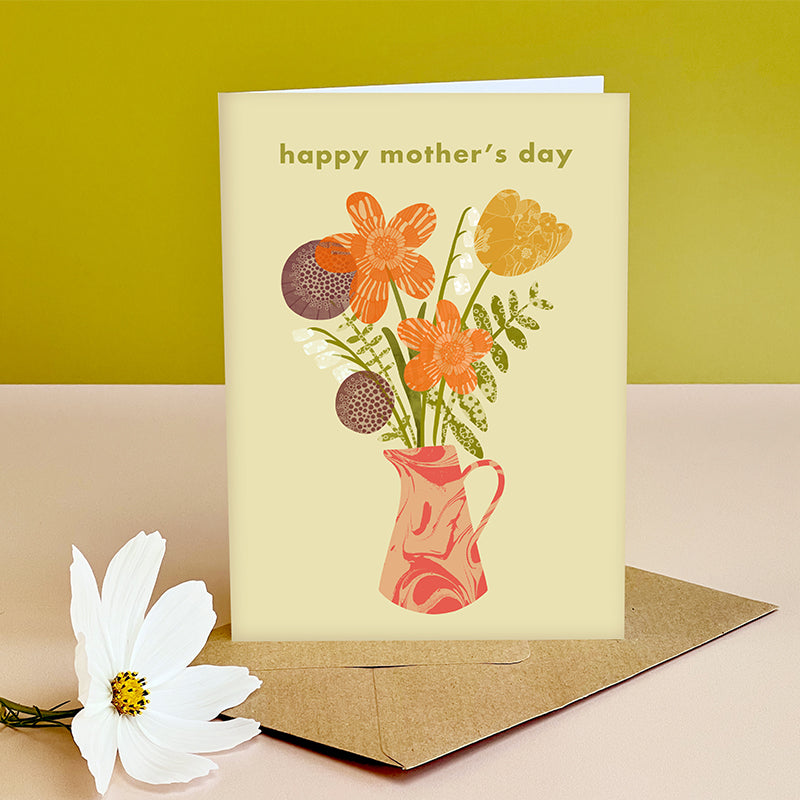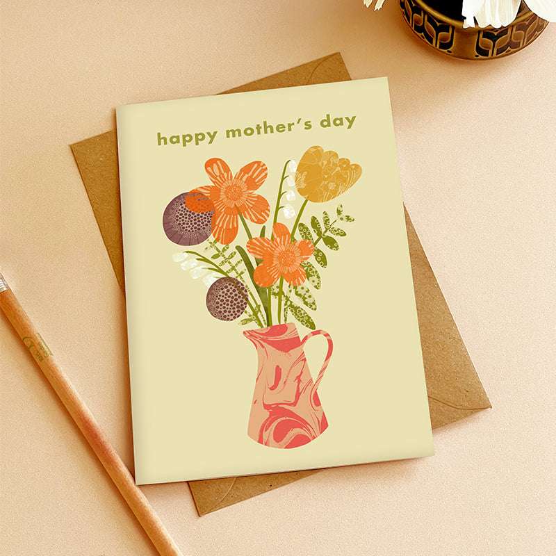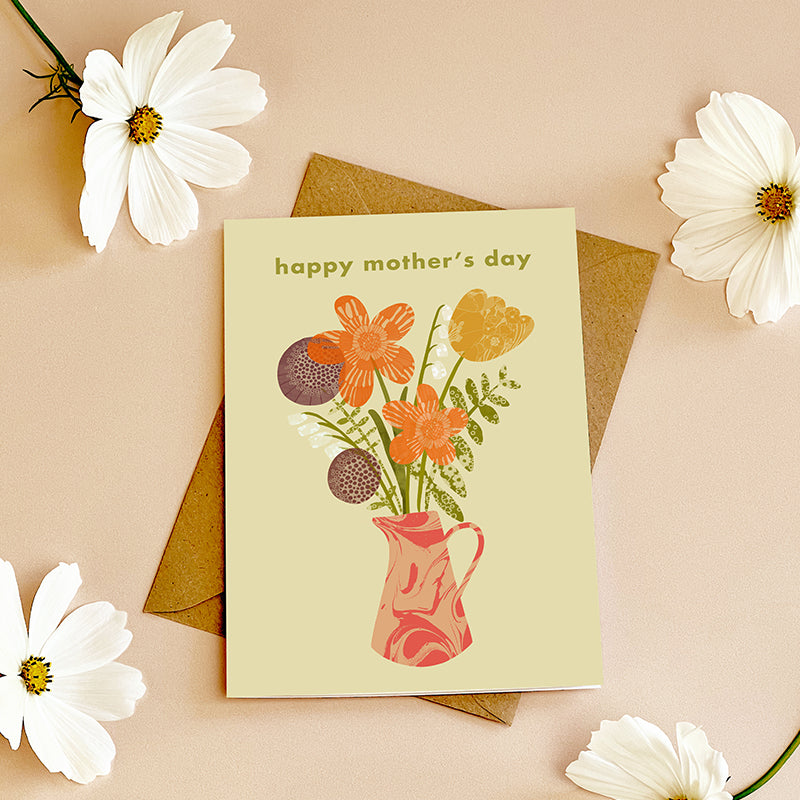 Brighten your Mum's day this year with this floral Mother's Day card. This card is an illustration of a marbled enamel jug full of colourful spring flowers with the perfect, classic message; Happy Mother's Day