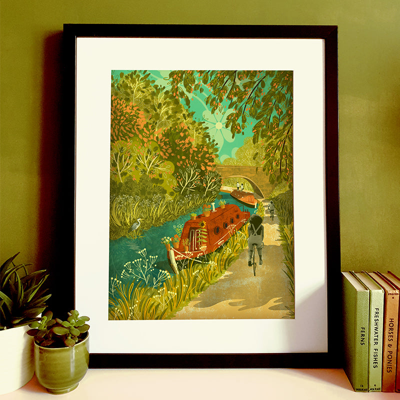 Transport yourself to this peaceful West Country canal with this Kennet & Avon canal print. This art print shows people cycling on the tow path past the moored narrowboats and resident Heron.