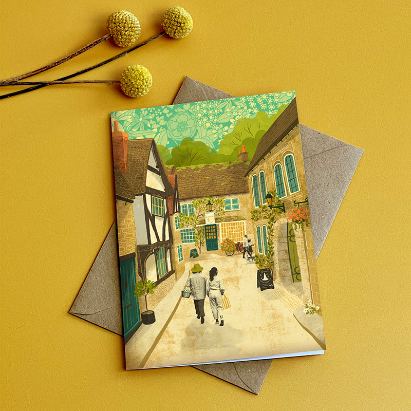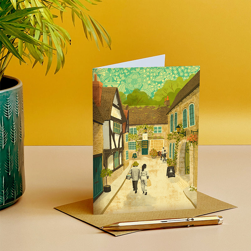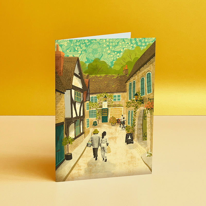 Transport yourself to the historical village streets hidden in Wiltshire with this Lacock greeting card. This art card features an illustration of people walking down one of the many beautiful roads towards the Lacock Bakery.